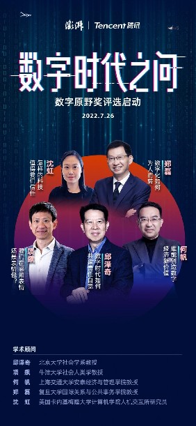 首届数字原野奖将“数字时代之问”作为本年度奖项的主题,邀请北京大学社会学系教授邱泽奇、牛津大学社会人类学教授项飙、复旦大学国际关系与公共事务学院教授郑磊、上海交通大学安泰经济与管理学院教授何帆、美国卡内基梅隆大学计算机学院人机交互所研究员沈虹五位大众影响力和学术影响力兼具的学者担任数字原野奖学术顾问。
