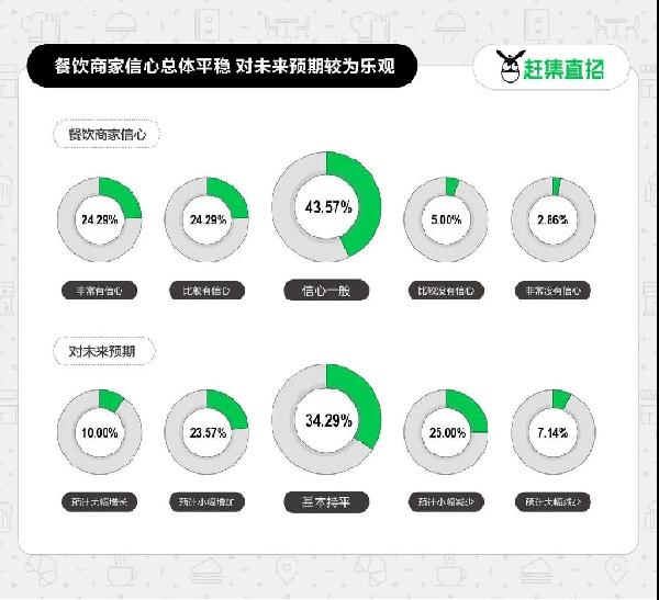 不难看出,在消费需求的带动下,餐饮商家收入仍具有较大发展空间,从业者普遍持乐观情绪。赶集直招数据显示,近五成餐饮业受访者表示对2022年餐饮消费发展有信心,67.86%的餐饮业受访者认为2022年餐饮消费可以基本持平或呈现增长趋势,其中有33.57%的受访者认为2022年餐饮消费会出现增长。