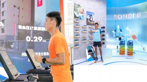 飞常跑量能量站以HOKA全新迭代之作Bondi 8为设计灵感,由半透明LED曲面屏打造开放式布局,顶部的发光灯带勾勒出数字8的俯瞰效果,搭配极富冲击力的醒目配色,为整个快闪店营造出充满活力的运动感。入口处打造了品牌溯源墙,让跑者们跟随HOKA的脚步奔赴山野,在勃朗峰的映衬下,感受诞生于山脉的HOKA对长距离耐力运动的坚守,领略户外运动的无穷魅力。店内设置了飞常跑量挑战区及Bondi系列鞋款试穿区,跑者们可以在巨型曲面屏营造的路跑风光中,尽情感受Bondi 8韧性缓震的飞凡脚感,享受身临其境般的户外奔跑体验,并可通过扫描现场二维码,将个人跑量实时汇入HOKA飞常跑量全国挑战能量池。此外,现场还设有飞常跑量补给站,参与挑战即有机会获取HOKA运动T恤和能量特饮,释放跑者专属夏日活力。为与更多在地跑者缔结更加深层次的联结,HOKA深圳万象天地直营体验店也将持续打造多元跑者社群体验服务,以丰富的跑团活动满足跑者由身至心的所有需求。