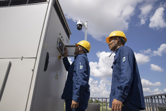 在大庆油田星火水面光伏示范工程现场,工作人员检查光伏配套设备。新华社记者 张涛 摄