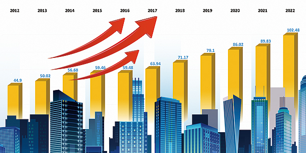 2012-2022年中国企业500强营业收入总额(万亿元)变化趋势