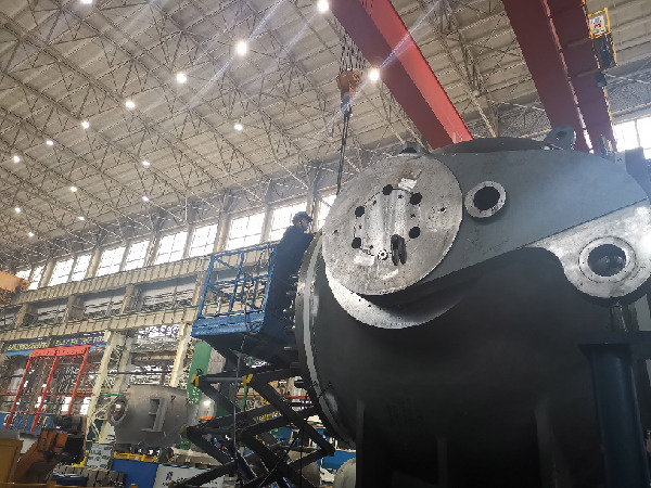 哈电集团哈尔滨电机厂有限责任公司水电分厂,工人在球阀上作业。