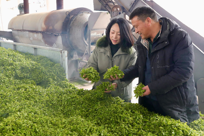 福建省连江县长龙镇一家制茶企业负责人在查看待加工的茶青(3月28日摄)。