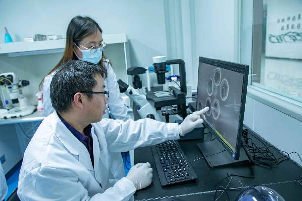 中国农业科学院兰州畜牧与兽药研究所博士岳耀敬和团队成员讨论羔羊体外胚胎发育实验。