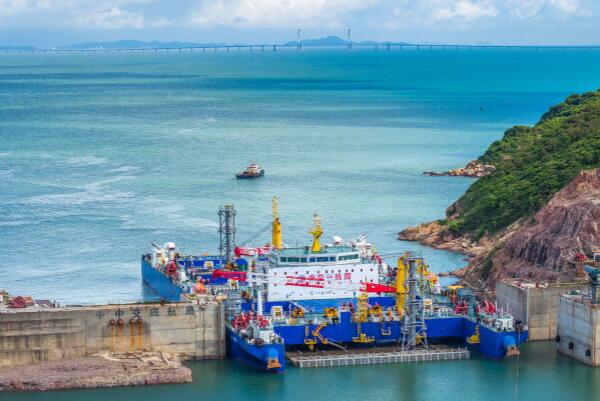 “一航津安1”号沉管运输安装一体船拖带E23管节和最终接头从珠海桂山岛启航,前往沉放水域(6月8日摄,无人机照片)。