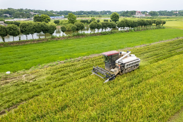 7月4日,在长沙市望城区茶亭镇苏蓼村,收割机在收割早稻。