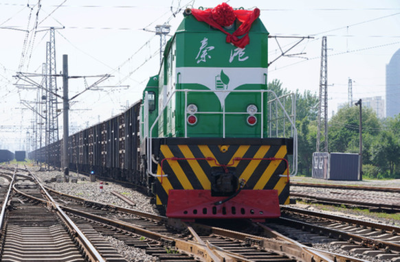 近日,由河北港口集团秦皇岛港股份有限公司与中国中车集团联合、利用退役内燃机车再造的秦皇岛港新能源1号机车在港区上线运行。图为秦皇岛港新能源1号机车在调运货物。