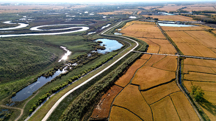 金秋十月,位于黑龙江省东部、松花江下游汤原县的黑鱼泡省级自然保护区内,聚集着成群结队即将南下越冬的鸟类,湿地里的水草也从鲜绿变向暖黄色。隔着一条堤坝,比邻的稻田泛着金灿灿的光,满眼丰收景象。湿地与农田相互映衬,构成一幅和谐共生的美丽画卷。