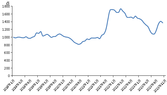 新华财经北京1月10日电(陆子琛、马兵)2023年12月份,新华·中盐两碱工业盐价格指数报1372.90点,较上期(2023年11月)下跌38.77点,跌幅2.75%;较基期(2018年1月)上涨372.90点,涨幅37.29%;较周期内最高点1736.66点(2022年4月)下跌363.76点,跌幅20.95%;较周期内最低点816.2点(2020年8月)上涨556.70点,涨幅68.21%。