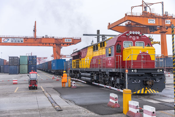 一列满载机械设备、整车及零部件等货物的中欧班列在重庆团结村中心站等候发车。记者 黄伟 摄