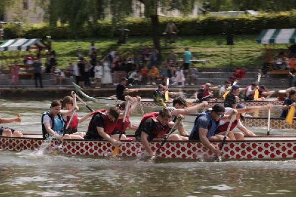 在斯洛文尼亚首都卢布尔雅那市中心的卢布尔雅尼察河上,8日举行了一场中国传统龙舟赛。13支队伍共约130人参加比赛,其中还包括来自克罗地亚、意大利和捷克的参赛队伍。