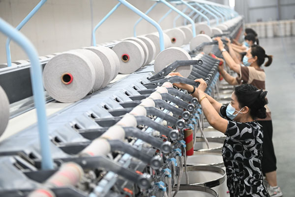 在泗洪县金锁镇一家纺织企业,员工在车间忙碌。近年来,江苏省宿迁市泗洪县金锁镇创新“共享厂房”模式,破解各村资金、工业用地、项目等不平衡难题,促进群众就业、企业发展。新华社记者 季春鹏 摄