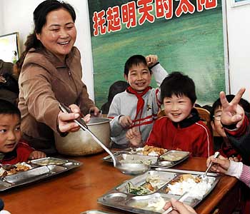 合肥市下岗工人罗莉莉(左二)在给孩子们盛菜。罗莉莉在当地街道的帮助下开办了一家餐馆。新华社发 |