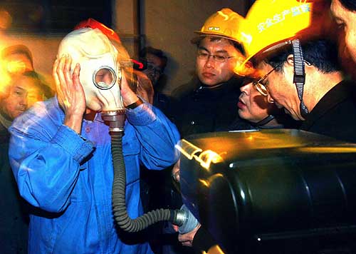 两会期间发生的抚顺矿业集团老虎台煤矿特大透水事故,使代表委员谈起安全生产的话题显得更加迫切。他们认为搞好安全生产必须破除畸形的发展观、政绩观。 图为安监人员在检查上海市化工研究院员工对防毒面具的使用常识(资料照片)。