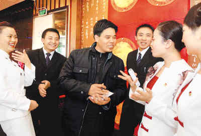 3月2日,农民工全国人大代表、重庆城建集团农工班班长康厚明(中)来到北京一家重庆餐馆,征求重庆籍外来工的意见。会上,他将就农民工医疗、工伤保险等问题提出相关建议。