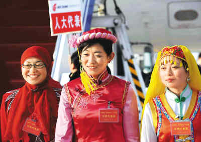 出席十一届全国人大一次会议的甘肃代表团抵达北京。新华社记者 王建华 摄