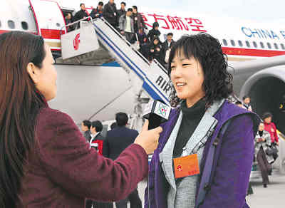 来自上海的农民工全国人大代表朱雪芹(右)在首都机场接受记者采访。新华社记者 刘卫兵 摄