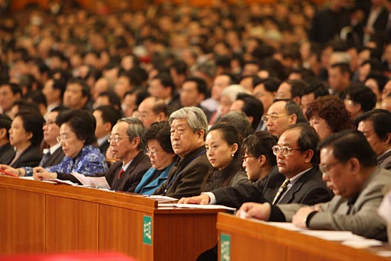 | 3月3日,中国人民政治协商会议第十一届全国委员会第一次会议在北京人民大会堂开幕。这是委员们在认真听会。新华社记者
