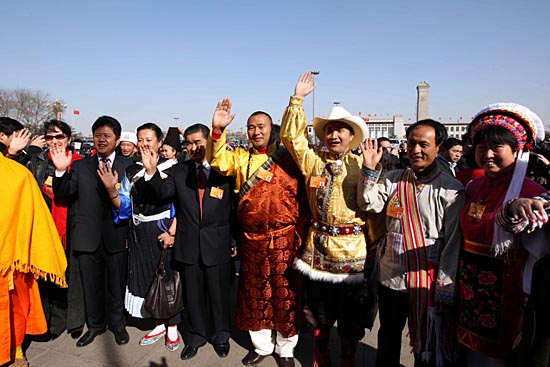 3月3日,中国人民政治协商会议第十一届全国委员会第一次会议在北京人民大会堂开幕。这是几名全国政协委员进入会场前愉快地招手致意。