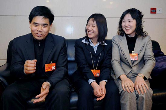 | 3月3日,三位农民工全国人大代表康厚明(左)、胡小燕(中)和朱雪芹(右)在北京交谈。新华社