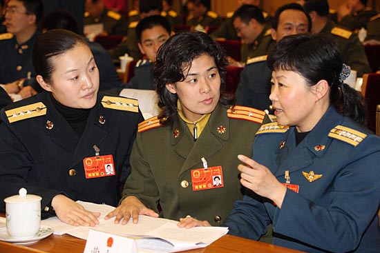 在十一届全国人大解放军代表团的代表中,有22名女代表,分别来自战备训练、国防科研、医疗卫生、文艺体育等多个战线。她们在国防和军队建设中发挥了重要作用,在人代会上忠实履行着自己的职责。