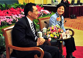 | 3月7日,全国人大代表林毅夫(左)、陈云英在十一届全国人大一次会议、全国政协十一届一次会议新闻中心共同接受记者采访。新华社记者