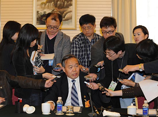 3月9日,政协中共界小组讨论对媒体开放。这是郑新立委员在回答记者提问。