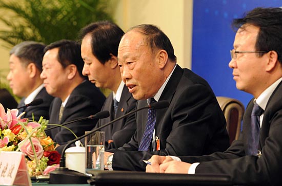 3月11日,两会新闻中心举行“钢铁行业与发展”专题采访,5位钢铁业全国人大代表共同接受中外记者采访。这是崔臣、邓崎琳、张晓刚、朱继民、李晓波(自左至右)在记者会上。