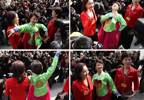 3月14日,中国人民政治协商会议第十一届全国委员会第一次会议在北京人民大会堂闭幕。这是李承淑委员(朝鲜族)走出会场后面对众多镜头欣然起舞。新华社记者 张燕辉 摄