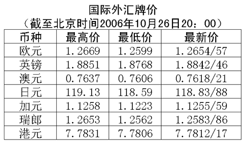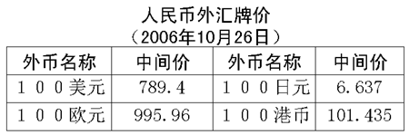 根据中国人民银行授权中国外汇交易中心发布的公告,2006年10月26日银行间外汇市场美元等交易货币对人民币汇率的中间价为:1美元兑人民币7.8940元,1欧元兑人民币9.9596元,100日元兑人民币6.6370元,1港元兑人民币1.01435元,1英镑兑人民币14.8356元。