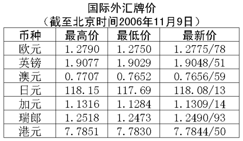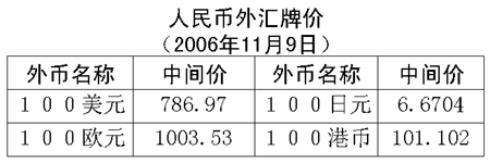 根据中国人民银行授权中国外汇交易中心发布的公告,2006年11月9日银行间外汇市场美元等交易货币对人民币汇率的中间价为:1美元兑人民币7.8697元,1欧元兑人民币10.0353元,100日元兑人民币6.6704元,1港币兑人民币1.01102元,1英镑兑人民币14.9785元。