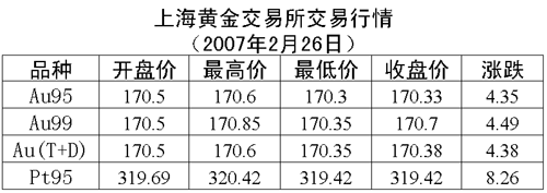 26日,上海黄金交易所黄金Au99.95收盘于170.33元/克,上涨4.35元/克,共成交5582公斤;黄金Au99.99收盘于170.70元/克,上涨4.49元/克,共成交964.80公斤;铂金Pt99.95收盘于319.42元/克,上涨8.26元/克,共成交106公斤。黄金Au(T+D)延期交易品种收盘于170.38元/克,上涨4.38元/克,共成交2454公斤。