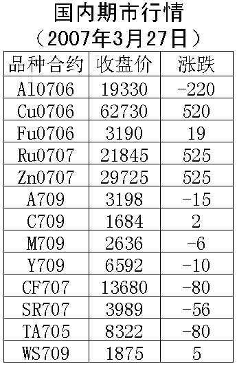 3月27日国内期货市场能源、农产品价格上涨,金属铝价格下跌。伦敦铜周一上涨157.5美元/吨,收盘6885美元/吨。沪铜周二上涨520元/吨,收盘62730元/吨,支撑价位62000元一线,上涨压力65000元一线。