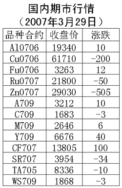 3月29日国内期货市场铝、燃油、豆类价格上涨,其余品种下跌。沪铜706合约周四下跌200元/吨,收盘61710元/吨,支撑价位61000元一线,上涨压力65000元一线。沪铝706合约周四上涨10元/吨,收盘19340元/吨,支撑19200元一线,上涨压力19800元一线。
