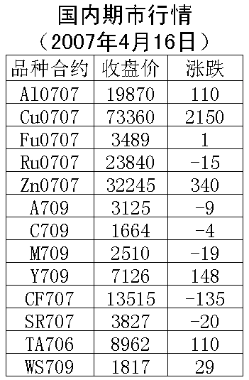 4月16日国内期货市场金属价格上涨。伦敦铜上周五上涨72.5美元/吨,收盘7732.5美元/吨。沪铜707合约周一上涨2150元/吨,收盘73360元/吨。