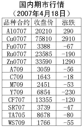 18日国内期货市场金属上涨,能源、农产品价格下跌。伦敦铜周二上涨315美元/吨,收盘8085美元/吨。沪铜707合约周三上涨2910元/吨,收盘75810元/吨达到涨停板,明日涨跌幅度扩大到5%,支撑价位73000元一线,上涨压力80000元一线。伦敦铝周二上涨52美元/吨,收盘2885美元/吨。沪铝707合约周三上涨290元/吨,收盘20210元/吨,支撑价位20000元一线,上涨压力20400元一线。