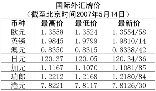 根据中国人民银行授权中国外汇交易中心发布的公告,2007年5月14日银行间外汇市场美元等交易货币对人民币汇率的中间价为:1美元兑人民币7.6739元,1欧元兑人民币10.3866元,100日元兑人民币6.3861元,1港币兑人民币0.98161元,1英镑兑人民币15.2150元。