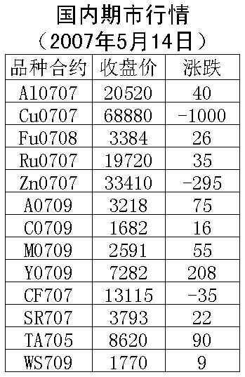 14日国内期货市场金属价格呈铜跌铝涨,能源、农产品价格上涨。伦敦铜上周五上涨65美元/吨,收盘7895美元/吨。沪铜707合约周一下跌10000元/吨,收盘68880元/吨,支撑价位68000元一线,上涨压力70000元一线。伦敦铝上周五上涨50美元/吨,收盘2877.5美元/吨。沪铝707合约周一上涨40元/吨,收盘20520元/吨,支撑价位20000元一线,上涨压力21000元一线。