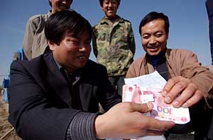 春耕时节,甘肃省临洮县农村信用社信贷员将信贷资金送到新添镇刘家沟门村村民(右)手中。 新华社记者 聂建江