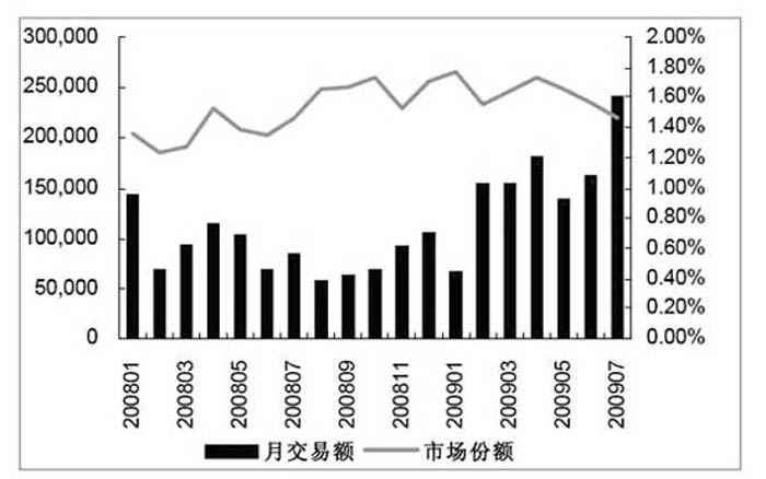 各月长江代理买卖证券总量和市场份额(包括股票、基金、权证和债券)