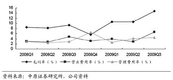 2009年3季报显示,2009年1-9月,公司实现营业收入321.14亿元,同比增长26.38%;归属于母公司所有者的净利润6.98亿元,同比增长83.58%,EPS为0.76元。三季度,公司实现营业收入125.25亿元,同比增长79.95%,环比上升4.78%;归属于母公司所有者的净利润2.45亿元,同比增长546.04%,EPS为0.27元。
