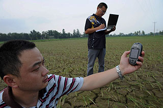 2009年7月15日,安徽六安市国元农业保险公司的员工在舒城县百神庙镇开展查灾定损赔付工作,工作人员用GPS卫星定位仪确定受灾田块的经纬度和面积。新华社发(陈力