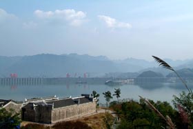位于三峡大坝上游的古民居与三峡大坝交相辉映。