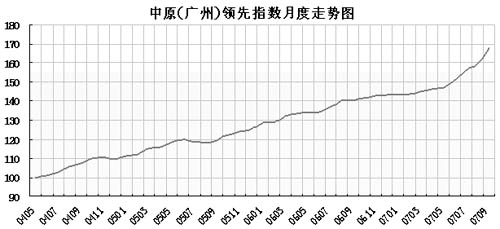 2007年9月,中原(广州)领先指数环比升幅达到5.0%,为167.5。今年以来,广州楼市价格呈持续上升趋势,尤其是进入下半年,每月升幅明显增大,领先指数的涨幅连续四个月在2%以上,并且本月达到了历史高位。9月份,出台了限价房销售办法、加息、提高首付、提高第二套住房贷款利率等房地产政策,但都未撼动楼价的上升走势。