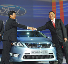 | 右为长安福特马自达总裁沈英铨 | 长安福特马自达汽车有限公司总裁沈英铨透露:实现福特汽车每年向中国市场投放两款全新车型的承诺,将有两款小车陆续生产和投放,全年销量进入前十的几率很大。