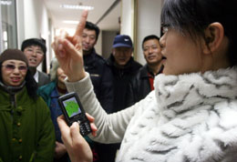 日前,沈阳市残疾人服务热线为聋人开通求助、咨询等手机短信服务。聋人用户只需向服务中心发送指定短信号码,就会得到所需要的法律、低保等方面的信息帮助。图为沈阳残疾人服务热线的工作人员为聋人讲解短信服务相关知识。