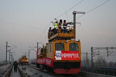 12月12日,我国首条时速达350公里的高速铁路客运专线——京津城际铁路第一条接触网导线成功架设,标志着京津城际铁路电气化工程架线施工全面展开。京津城际铁路电气化工程引进德国高速铁路技术,全长115公里,将于北京奥运会前投入使用。届时京津通达只需半小时,且5分钟发一次车。图为承担施工任务的中铁电气化局一公司的职工在架设接触网导线。