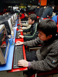 来自中国电信上海公司的最新数据显示,上海的宽带用户已达300万户,平均每六人就拥有一根宽带,成为全国宽带用户数量最多的城市。图为几名上海大学生在网吧内用装有宽带的电脑上网。