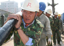 福建龙海市投资500多万元,建设人民中路地下电缆工程。春节在即,电力工程队加班加点奋战施工,力争早日完工。图为供电公司电力工程队正在人民东路铺设电缆。