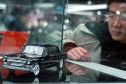 中国长春汽车文化园展销中心正式“开门迎客”,它是继汽车博物馆之后,中国长春汽车文化园中第二个向社会开放的项目,该中心总建筑面积约5万平方米,可以同时展卖上千辆商务及家庭用车,规模在东北地区首屈一指。图为一位参观者在欣赏展销中心内的红旗车模型。